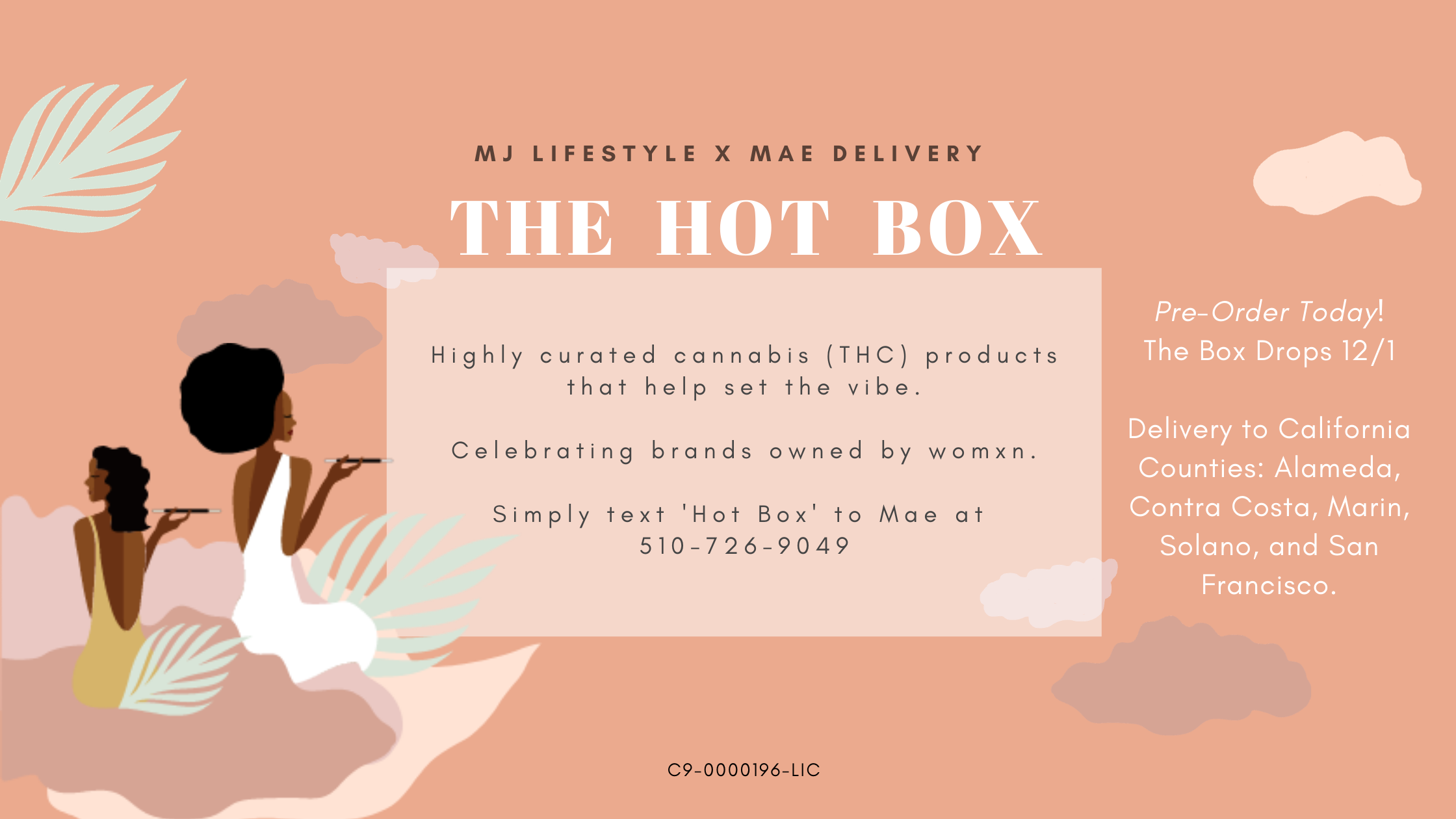 Releasing Green Wednesday (the day before Thanksgiving), MJ Lifestyle has joined forces with Mae Delivery for our first-ever Highly Curated THC Box ‘The Hot Box’. Mae is a new delivery service powered by Community Gardens, a Black-owned, veteran-owned, and family-owned Oakland-based cannabis retailer. Community Gardens was the first equity business to be licensed by the State of California for adult-use sales of cannabis, based on their participation in the revolutionary City of Oakland Cannabis Equity program. We are thrilled to be part of Mae’s new personal concierge cannabis delivery service bringing cannabis goods to Bay Area doorsteps. No apps or passwords required, a simple text to Mae will connect you with your personal budtender and deliver the goods!